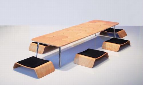 ,日式风格的餐桌和椅子,可以很方便的折叠到一起。