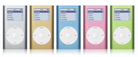 对比iPod mini,iPod nano用黑色替换了原来的金色,而且蓝,粉,绿的颜色加大了色彩饱和度。