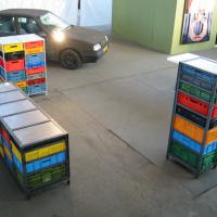 这是Mark van der Gronden 2003年的一个作品:Krattenkast(前文-Heavy Duty Table Ware)。我们在以前的一篇文章也曾提到过将这些多彩的塑料运货箱放在一起是挺有风味的(工作室风味)。这个Mark van der Gronden的Krattenkast将这些盒子陈放到镀锌的金属架上。